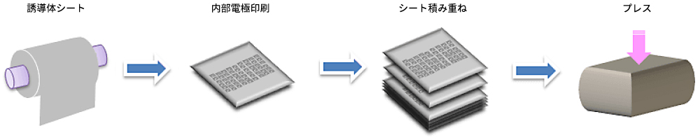 まず、セラミック粉末(主にBaTiO3:チタン酸バリウムやフェライト)をバインダーや溶媒と混合し、ペースト状にします。このペーストを薄く平らに延ばして乾燥させ、グリーンシート(未焼成セラミックシート)を作製します。グリーンシート上には、内部電極となるNi(ニッケル)などの金属材料を、印刷技術により精密に形成します。その後、シートを必要な枚数だけ積み重ねてプレス・カットすることで、多層構造を作り出します。