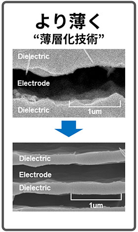 高い静電容量を、極めて小型なサイズで実現するためには、シートおよび電極をできるだけ薄く形成し、ずれなく積み重ねる精密なプロセス制御が不可欠で、これらすべてを高度に実現できることがムラタの強みとなっています。