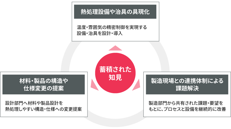 また、環境負荷低減の観点から省エネルギー化に取り組み、熱効率の高い炉やエネルギーリサイクル技術を導入しています。こうした取り組みにより、安定した高品質・高信頼性の製品製造と、持続可能なモノづくりの両立を実現しています。