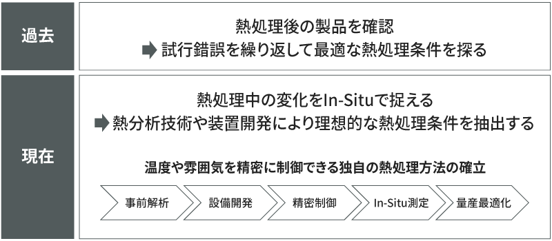 従来は、高温かつ密閉された炉内での変化を直接観察することが難しく、熱処理後の製品を確認しながら試行錯誤を繰り返して条件を探るしかありませんでした。しかし、自社の熱分析技術や装置開発によって、熱処理中の変化をIn-Situで捉えることを可能にしました。これにより、熱処理中の課題を明確化し、理想的な条件を抽出できるようになっています。さらにシミュレーション技術を駆使して、炉体の熱歪み・温度分布・ガス流れ・反応状態などを事前解析し、この結果を設備設計に反映することで、温度や雰囲気を精密に制御できる独自の熱処理方法を実現しています。