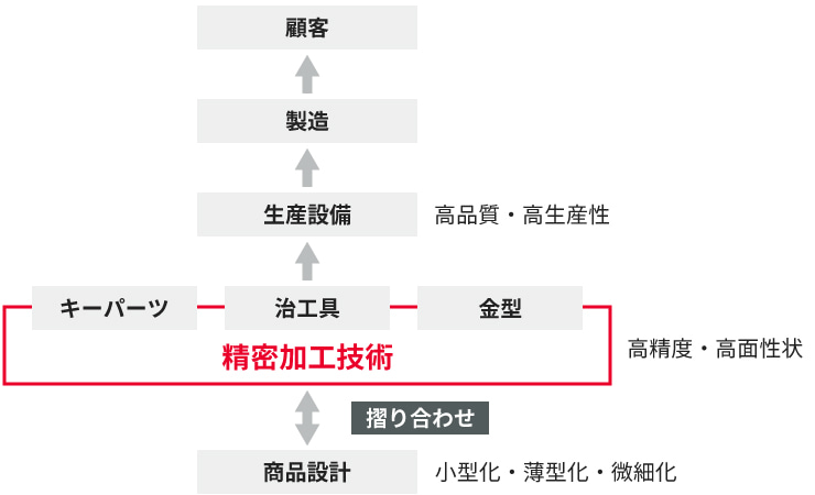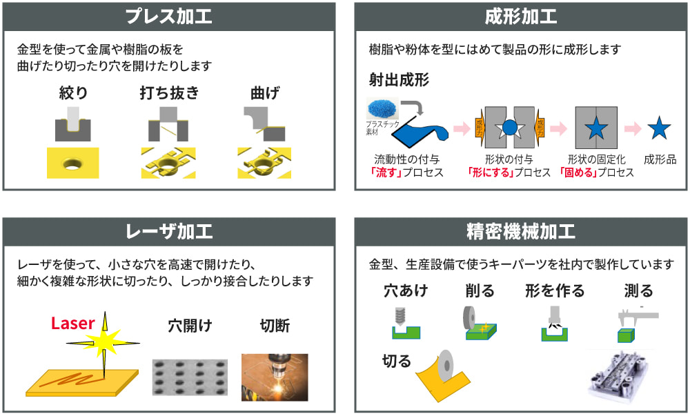 創業当初は、市販設備を用いた金属プレス加工/樹脂成形加工で対応していましたが、電子部品の小型化が進むにつれて、使用する金型にも特に高い精度が求められるようになりました。これを受けて機械加工技術を確立し、自社製設備のキーパーツや治工具へと展開することで、モノづくりの高精度化に貢献しました。