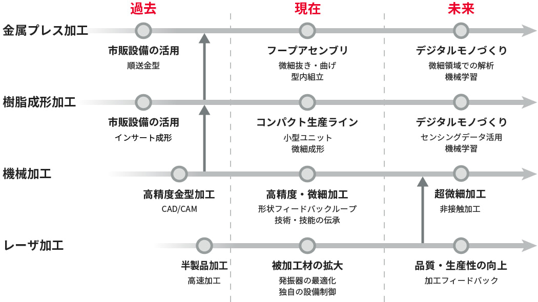 1990年代後半には、機械加工技術の確立により、金属プレス加工技術/樹脂成形加工技術も進化しました。一般的な市販設備から電子部品製造に特化した専用設備を開発し、生産性向上を実現しました。2000年代に入ると、セラミック加工などの分野で接触式機械加工では生産能力が不足する課題があり、非接触でのレーザ加工技術を導入し、技術領域を拡大してきました。