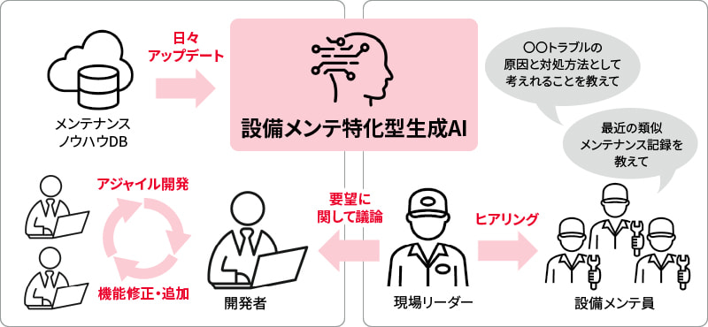 さらに、開発を一度で終わらせず、継続的に製造現場の声を取り入れながら改良しています。例えば製造現場からの設備メンテナンス記録の情報をより迅速に活用したいという要望に対して回答時間を従来の1/5に短縮、メンテナンス作業をしながら使用したいという要望に対して音声入力機能や回答読み上げ機能を追加実装しました。こうした改良の積み重ねにより、現場に最適化されたシステムへと進化し続けています。
