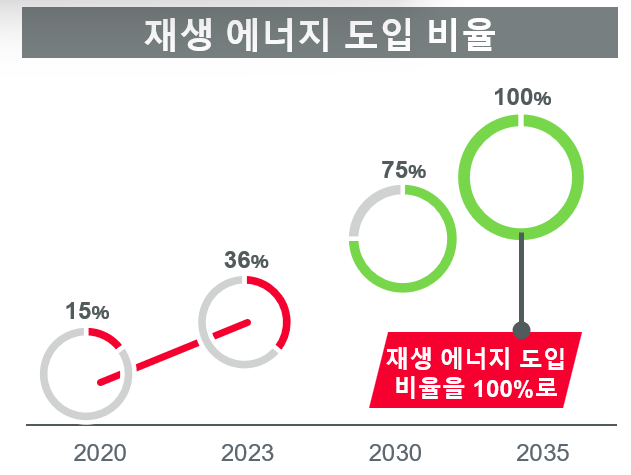 먼저, 사업 활동에서 사용하는 전력을 100% 재생에너지로 바꿔 RE100의 달성 시기 목표를 기존의 2050년도에서 15년 앞당긴 2035년도로 설정한다.