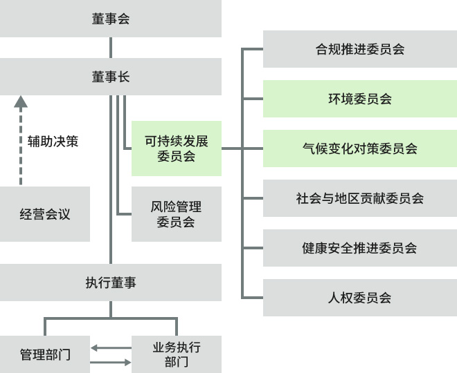 环境委员会根据客户需求和社会趋势的变化,审议和决定应解决的环境问题(资源循环利用、生物多样性等),并通过事业活动推进相关政策和中长期举措。气候变化对策委员会推进温室气体减排、可再生能源的引进等气候变化对策。各委员会讨论的事项呈报可持续发展委员会并接受审议后,接受董事会的监督。
