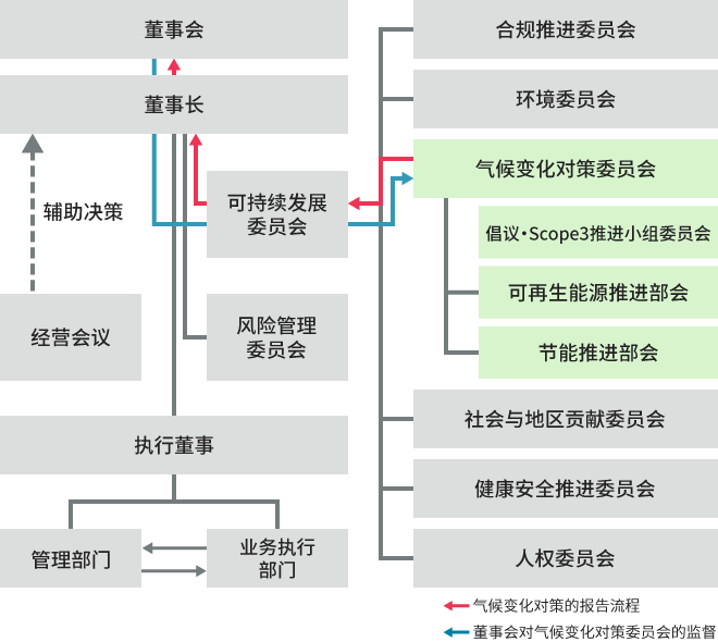 村田在气候变化对策方面正在强化治理体制。董事会负责就包括气候变化在内的各种风险和机会进行说明。董事长和代表董事副社长分别担任可持续发展委员会和气候变化对策委员会的委员长,负责对气候变化对策进行监督。