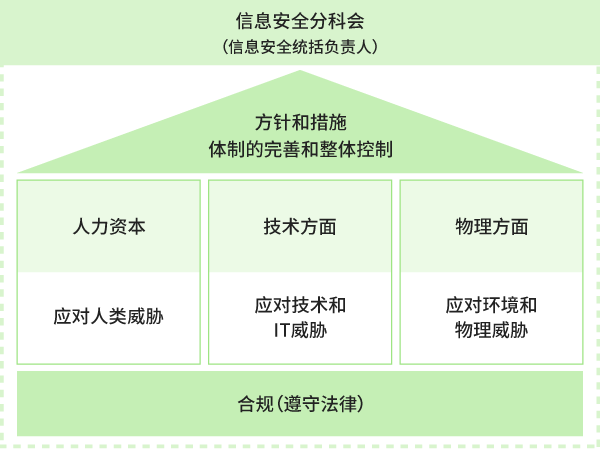 设立信息安全分科会作为风险管理委员会的下级组织,在信息安全统括负责人(首席执行董事 管理本部・本部长)的职责下,我们的目标是通过日常执行信息安全风险管理的PDCA循环,尽可能降低风险,从而避免发生被判断为可能产生重大影响的事件。