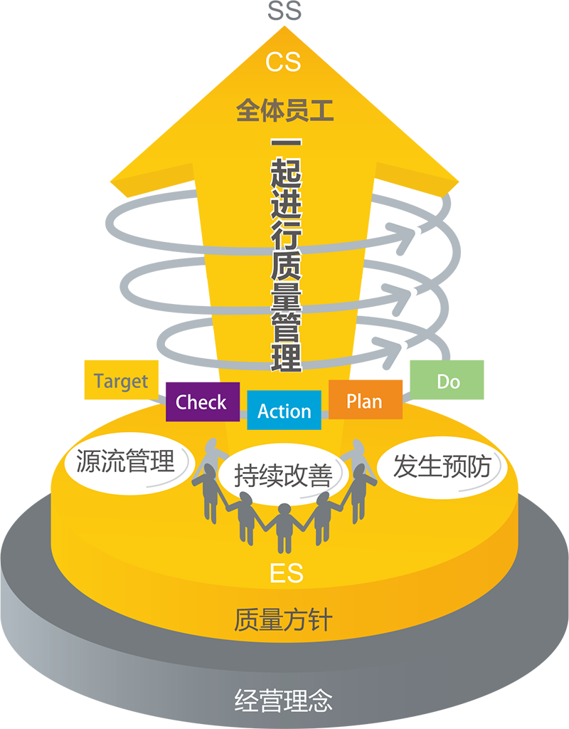 将“源流管理”、“防患未然”、“持续改善”视为重要的关键词,让全体人员都感受到自己的工作价值,并提升自己的工作质量(全员投身质量管理),以螺旋式的提升来满足客户,进而实现社会满足的目标。
