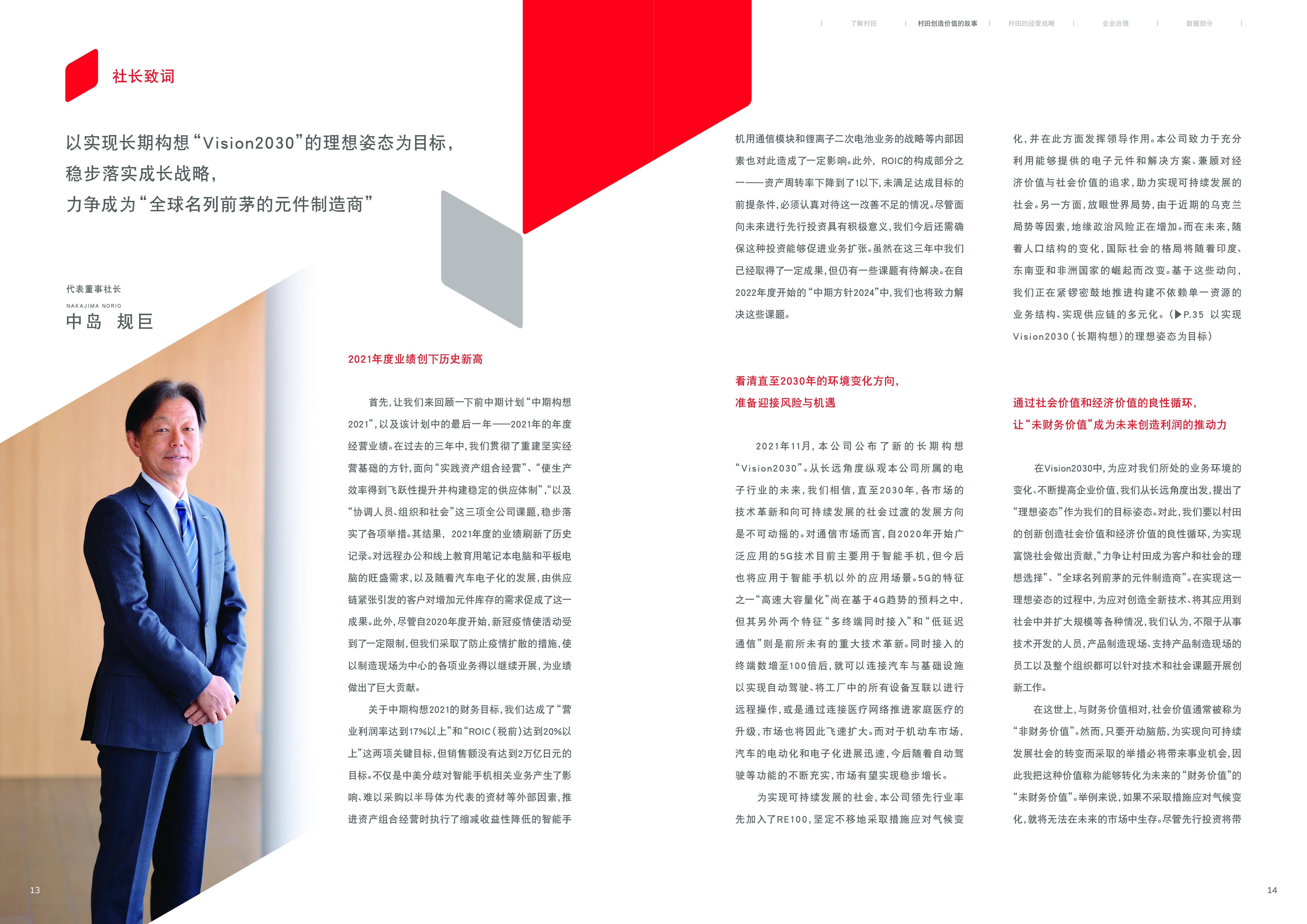 在《Murata value report 2022》中,本公司通过《中期构想2021》回顾了一直以来为客户提供的价值,同时针对长期构想《Vision2030》中的理想状态,总结归纳了今后将开展的措施。