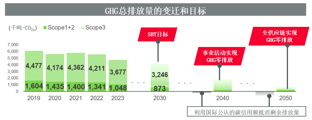 如上所述,我们加快了达成RE100的相关工作,与此同时,我们也大力推动削减燃料和燃气消耗产生的GHG排放量,争取在2040年度实现Scope1+2的GHG净零排放(碳中和),并在2050年度实现包括Scope3在内的全供应链的碳中和*1