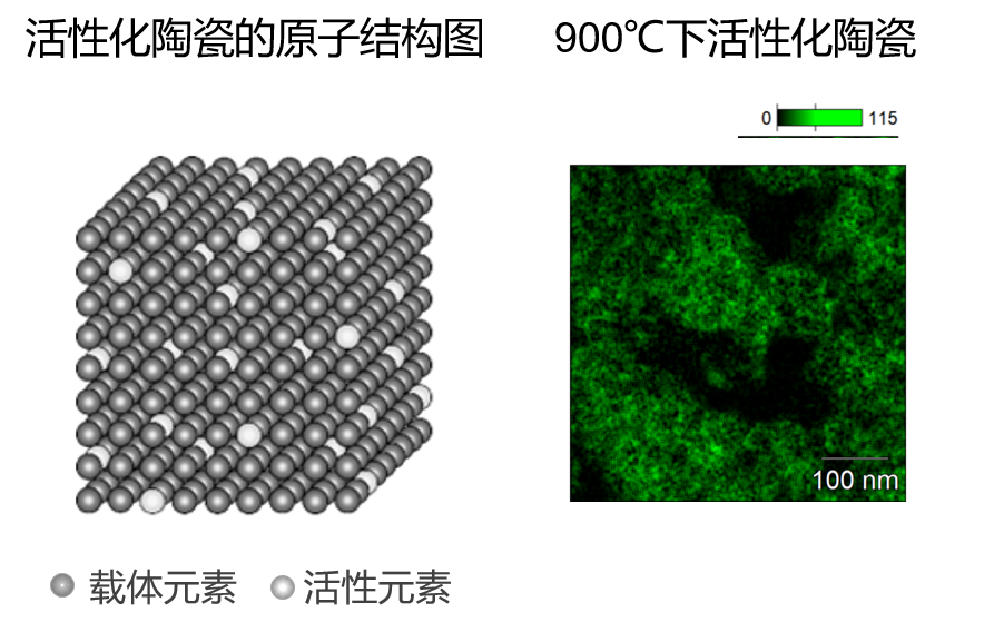 活性化陶瓷的活性点在原子水平分散,不会因热而发生凝聚。即使在900℃下加热100小时,也能保持活性点分散的状态,继续保持活性性能。