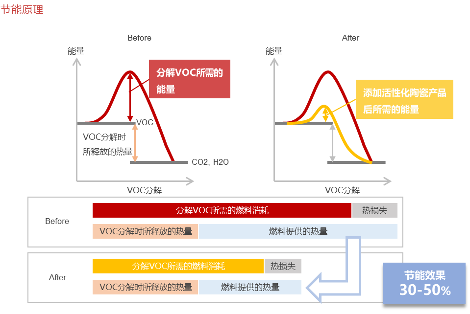 分解VOC需要很多能量,同时装置散热也会造成热损失。通过在装置中投入“活性化陶瓷”,能够减少分解所需的能量,从而降低相应的燃料消耗量。