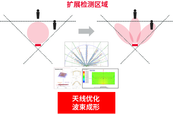 市场需求不仅体现在检测目标的多样化,更要求更高性能以实现更精准的位置与运动检测。为满足这些需求,我们开发了可实现近100米远距离位置检测的技术。该技术通过优化阵列天线配置增强指向性并延长波束覆盖范围,同时借助波束成形技术实现广角无线电波传播,从而使检测区域较以往覆盖更广。
